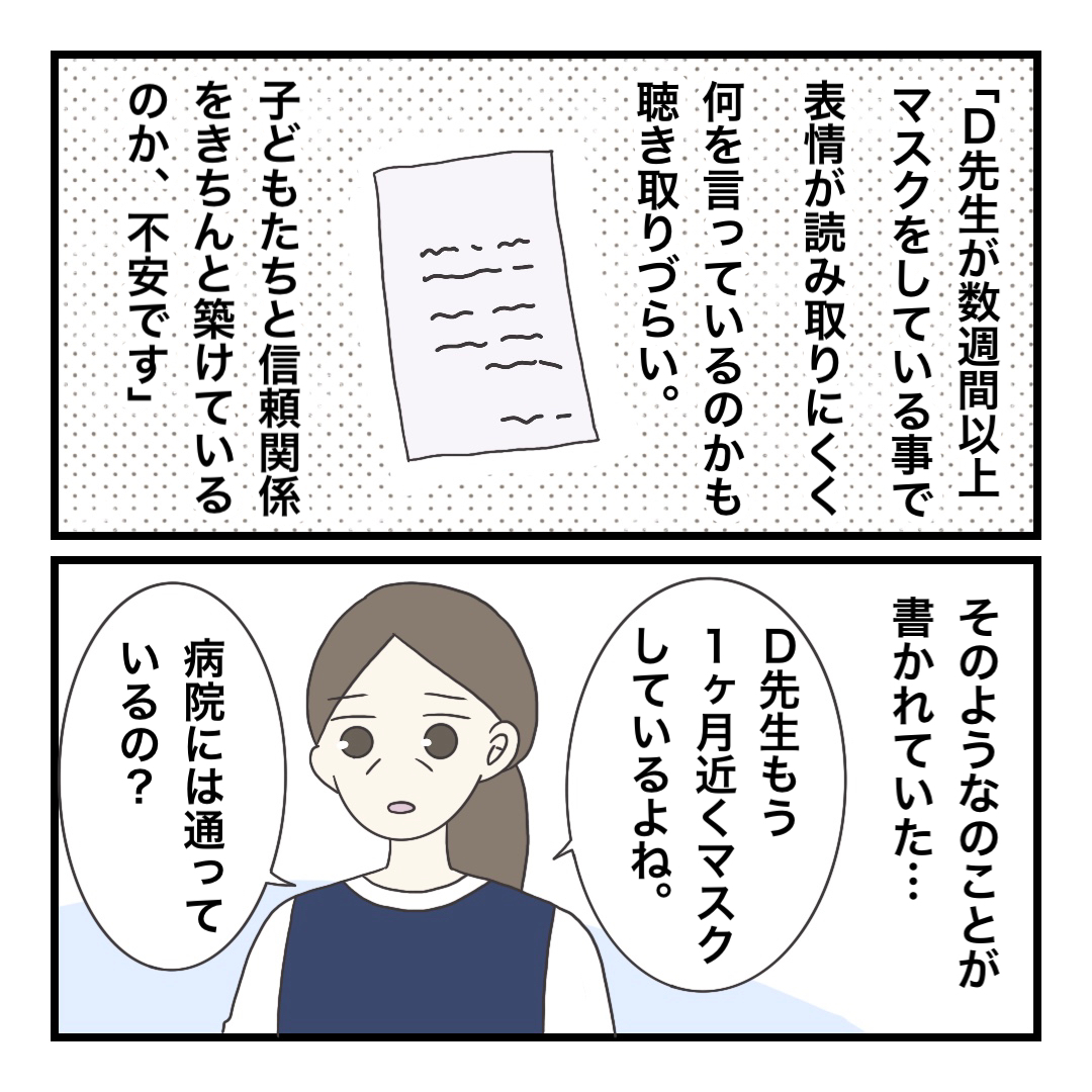 確かにD先生の場合はマスクをすると声が小さくて、表情も笑ってるのか笑ってないのか?ちょっとわかりにくかったり
