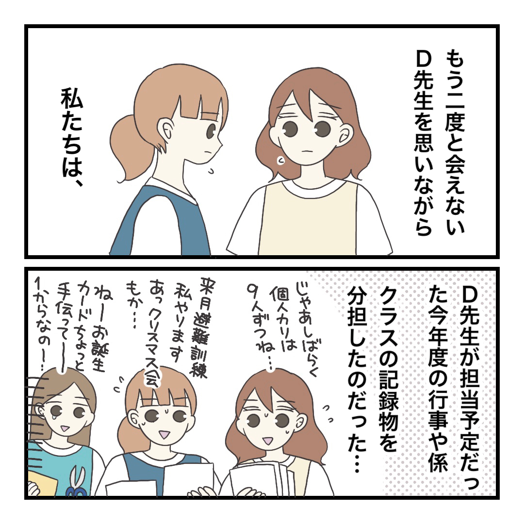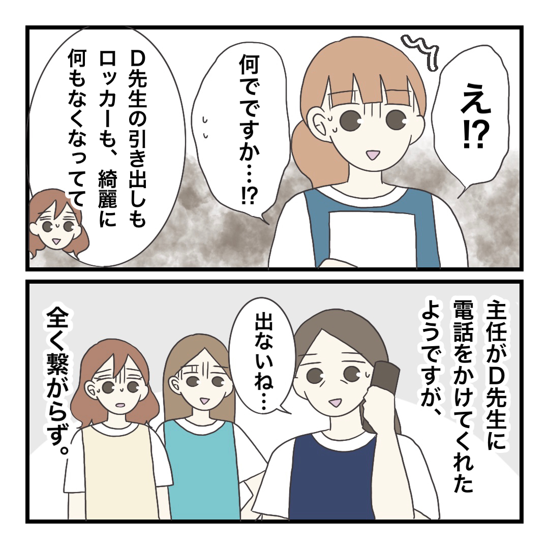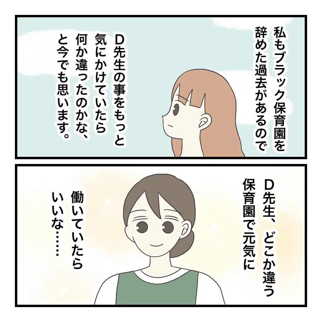 「何でD先生は突然辞めたんだろう」と、しばらく園内はざわついていましたが、そのうち新しい先生が入ってくれてバタバタも落ち着き…