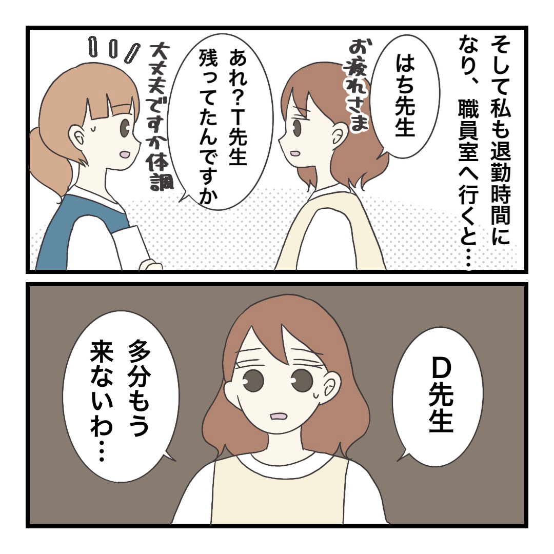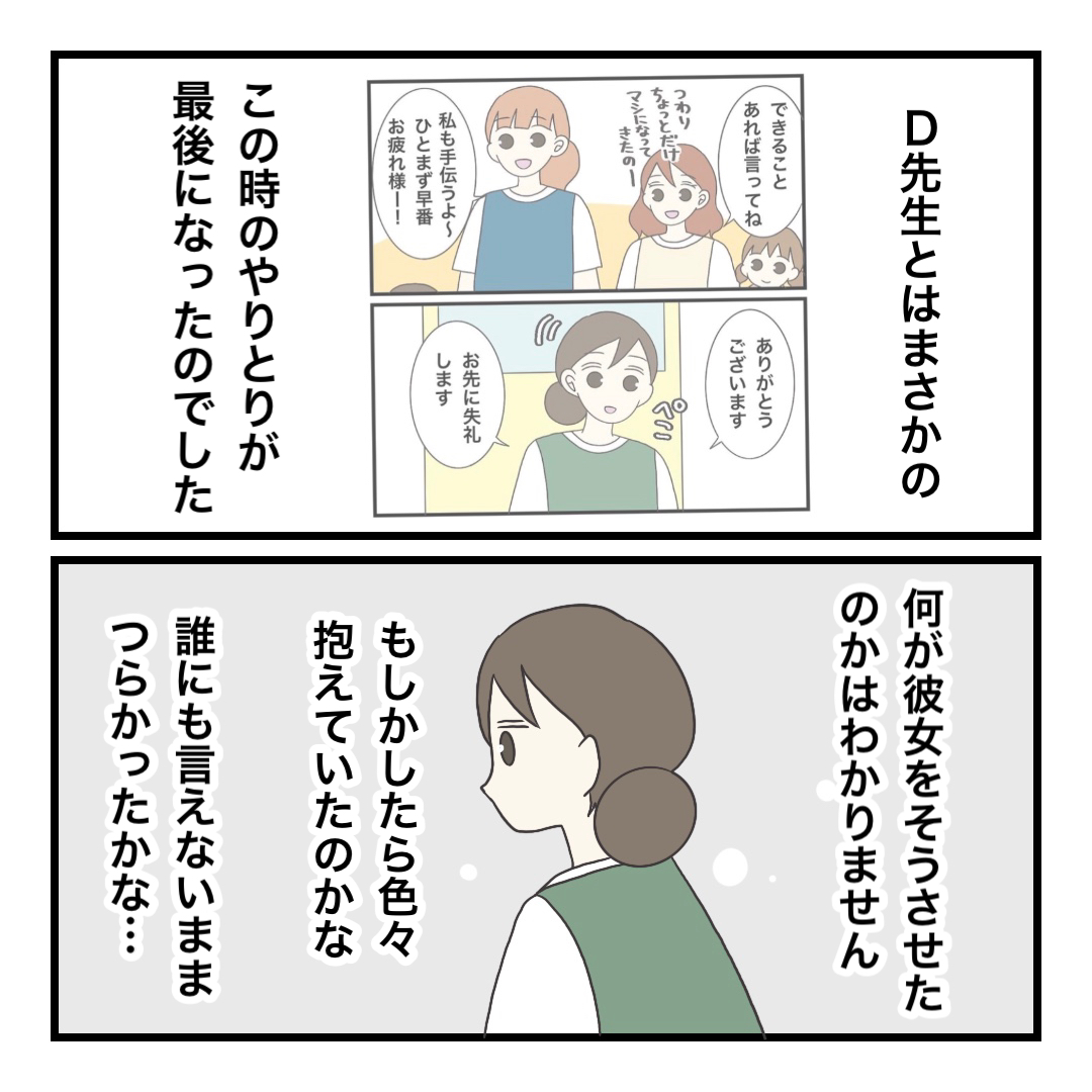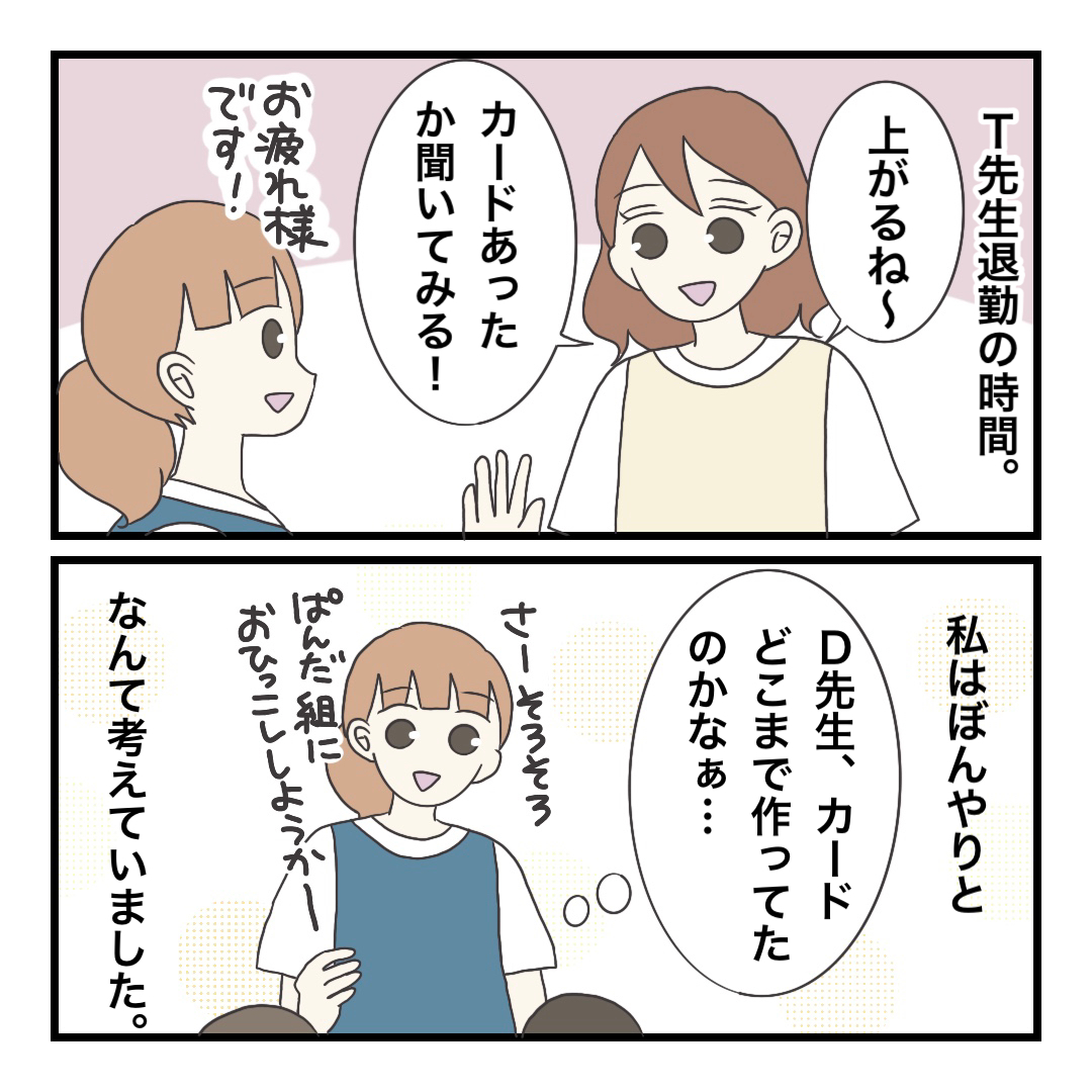 「何でD先生は突然辞めたんだろう」と、しばらく園内はざわついていましたが、そのうち新しい先生が入ってくれてバタバタも落ち着き…